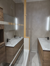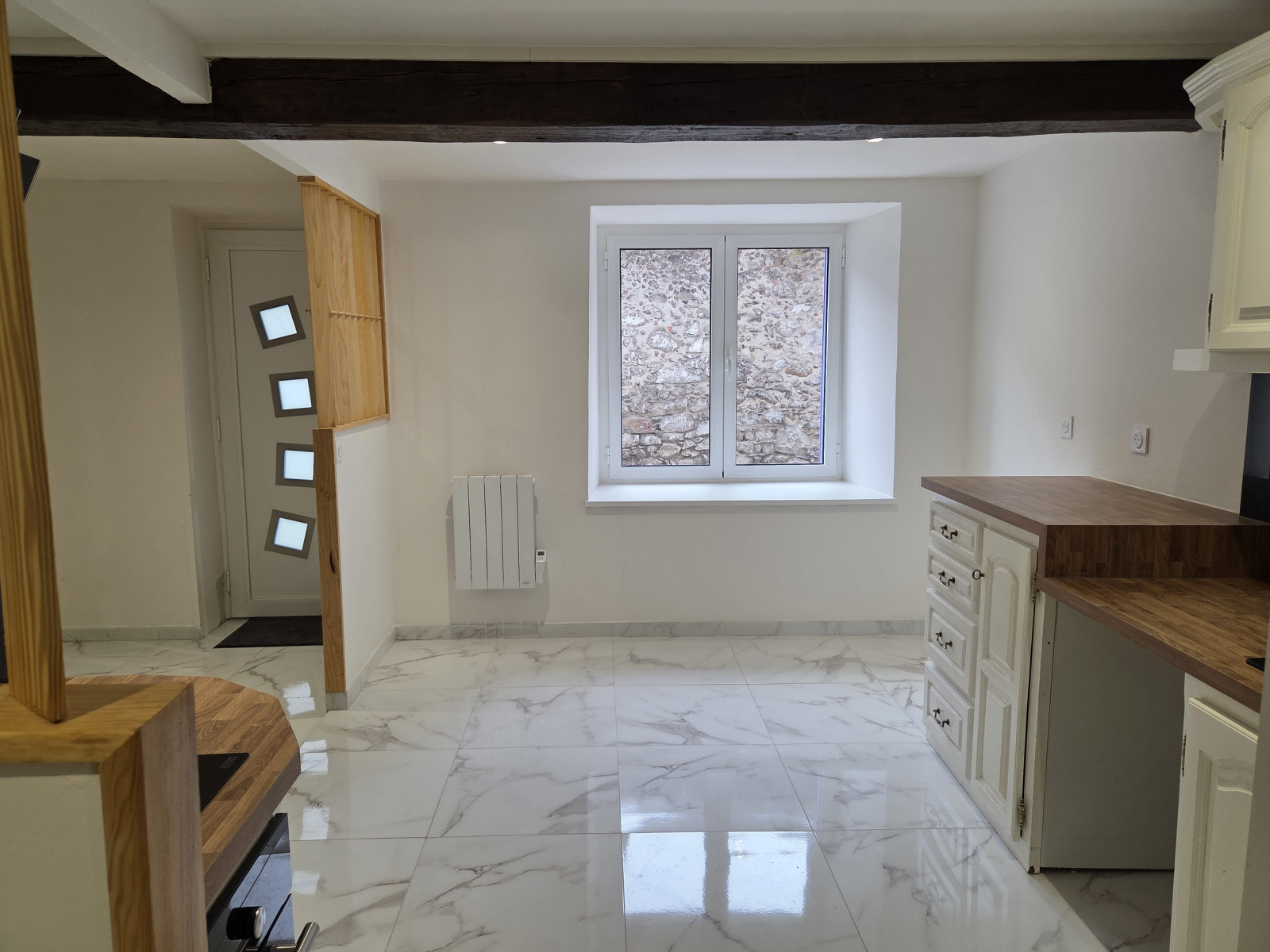 Maison dans un quartier calme, idéalement située, entiérement rénovée, entrée, cuisine équipée, arrière cuisine, espace repas. Au premier, salon cheminée, une salle de bains, wc. Au niveau supérieur deux chambres, salle d'eau wc.
