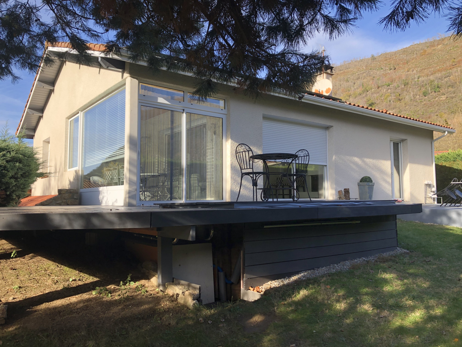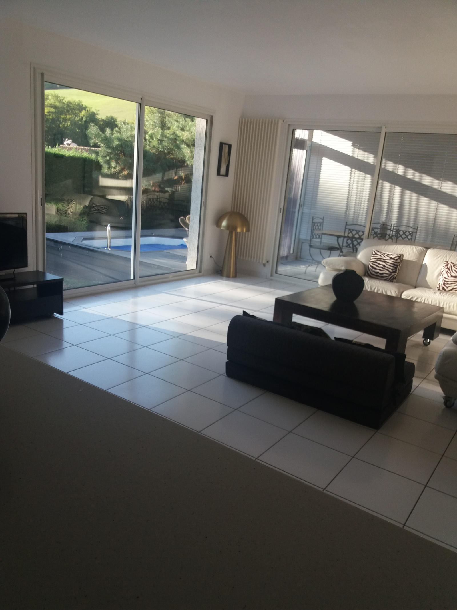 A la périphérie d'un village paisible, école primaire, villa bâtie en 2033, terrasse avec une petite piscine, abri auto, abris de jardin. Composée, au rez de chaussée (semi-enterré) , d'un hall, d'une entrée, un appartement T2, séjour baie vitrée, cuisine équipée, une chambre, salle de bain, wc. Une buanderie, un atelier, un bureau. A l'étage (niveau du jardin), un séjour 31 m2 cheminée insert, véranda 11 m2, cuisine équipée 15 m2, deux chambres , salle d'eau, wc, espace bureau. l'ensemble en trés bon état.